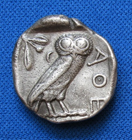 Owl, the sacred animal of the goddess Athena, on an Athenian silver tetradrachm, ca. 449-404 BCE. The CHS Library.