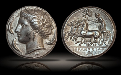 Syracuse, Sicily, and its nymph goddess Arethusa surrounded by dolphins. Silver tetradrachm, ca. 310 BCE.