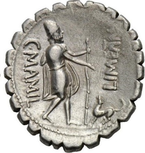 The dog Argus on a silver denarius, 82 BCE. This image of a young and energetic Argus does not correspond well with the portrait of the old and sick dog from the Odyssey.