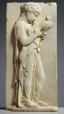 Greek marble stele depicting a girl kissing her pet pigeon. Metropolitan Museum of Art, ca. 450-440 BCE.
