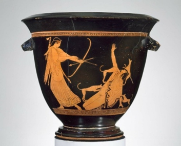 Artemis shooting at Actaeon with his own hunting dogs attacking, seeing him as a deer. Bell krater to mix water and wine by the so-called Pan Painter, ca. 470 BCE. Museum of Fine Arts, Boston.