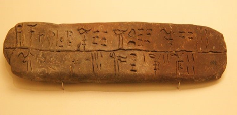 That animals were used in farming by the early Greeks is witnessed by texts on clay tablets from the Mycenaean civilization (ca. 1400-1100 BCE), written in the earliest form of Greek, the so called Linear B script. This tablet was discovered at Knossos on Crete and mentions goats, boars, cows, and bulls. Dated to ca. 1400 BCE.