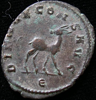 Artemis’/Diana’s deer on a Roman billon Antoninianus, from the reign of Emperor Gallienus, ca. 267/268 CE.  DIANAE CONSERVATORI AVGVSTI (to Diana (Artemis), the Preserver of the Emperor).