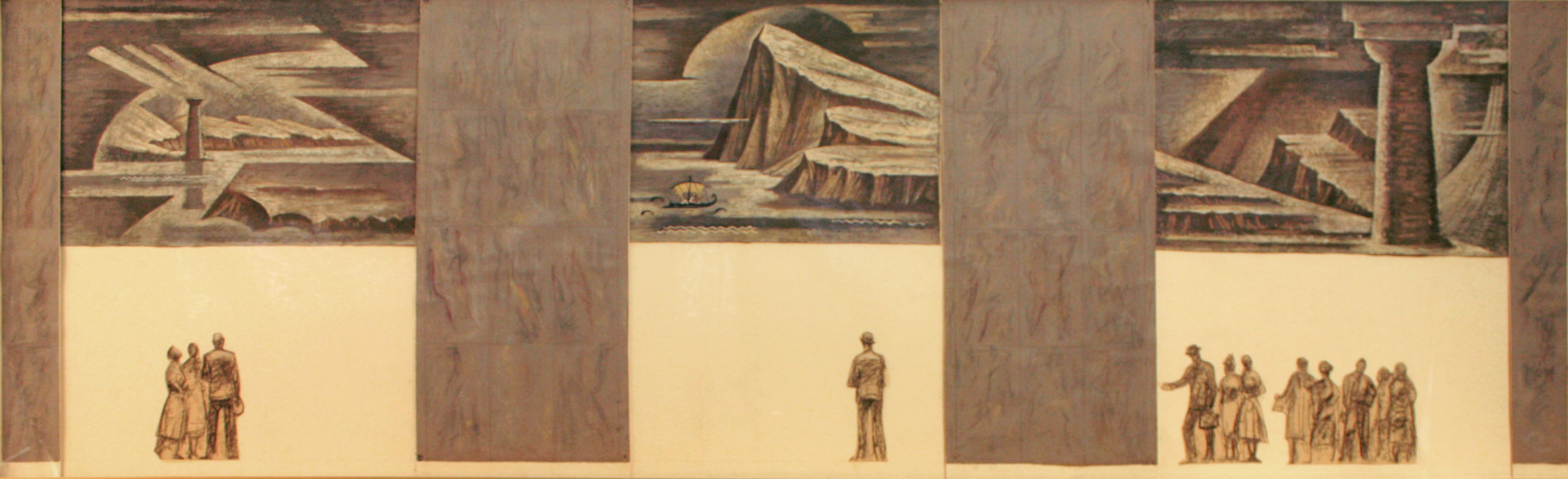 A year later Meière was beginning discussions with Foscato about a mural she was designing for Prudential Insurance. The well-known company logo featured the Rock of Gibraltar and the tag line “The Prudential has the Strength of Gibraltar.” Meière had found herself moved by the strength of that landmark when she passed through the Straight decades before. So for the Prudential mural she depicted Hercules sailing through the Straight and past the Rock. In Greek mythology the Pillars indicated the limit of the known world. For mere humans, that spot would mark the limit of their journey, the point where they turn back. Thus Hercules’ journey came to represent a heroic and unending quest for knowledge with the pillars as the gateway to the unknown.