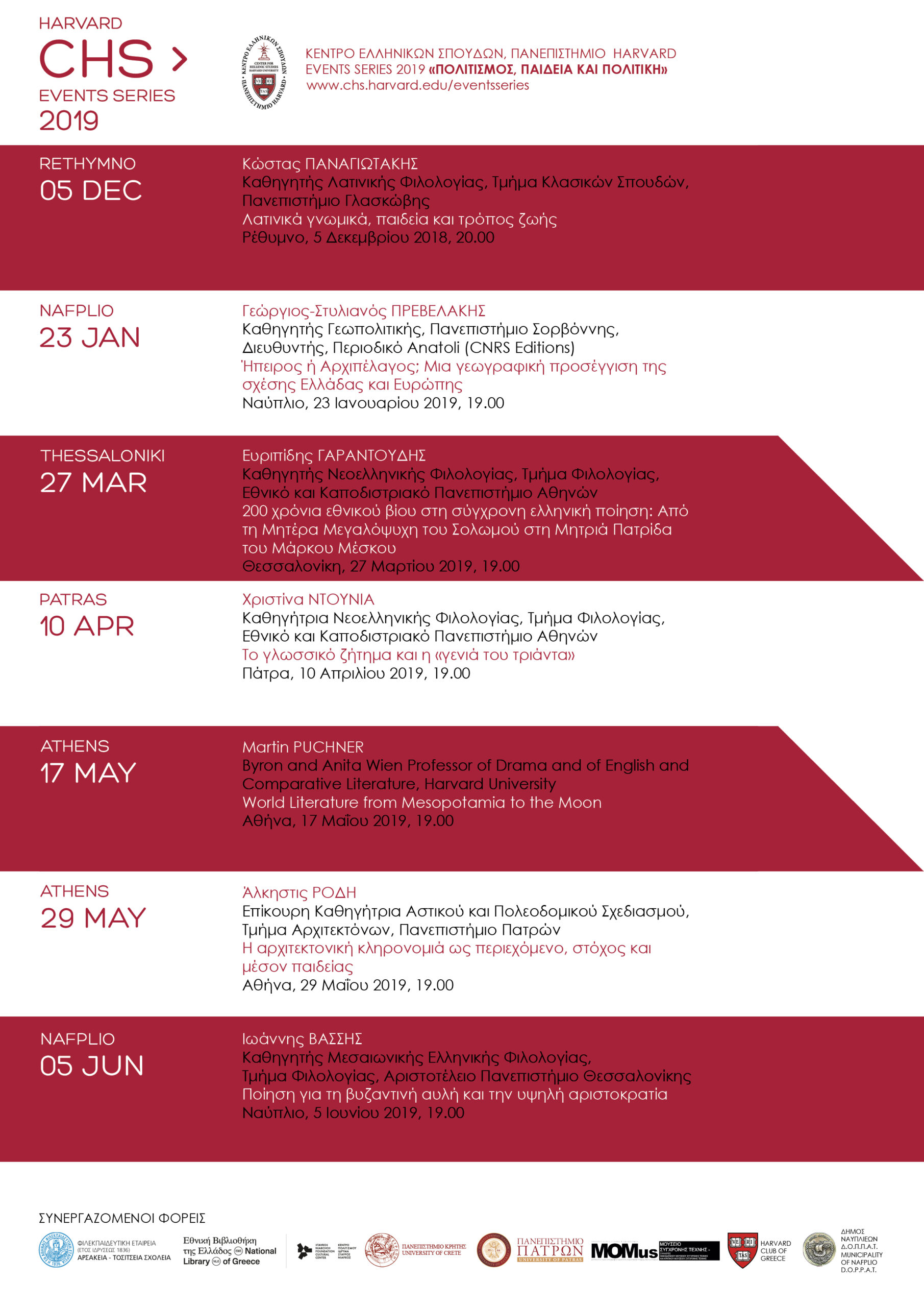 The Events Series 2019 includes seven lectures that begin on December 5, 2018 and continue through June 2019. The lectures will take place in Nafplio, Athens, Rethymno, Thessaloniki, and Patras. The institutions collaborating in the implementation of the current program include the Society for the Promotion of Education and Learning, the National Library of Greece, the University of Patras, the University of Crete, the MOMus-Museum of Contemporary Art, the Harvard Club of Greece, and the Municipality of Nafplio.