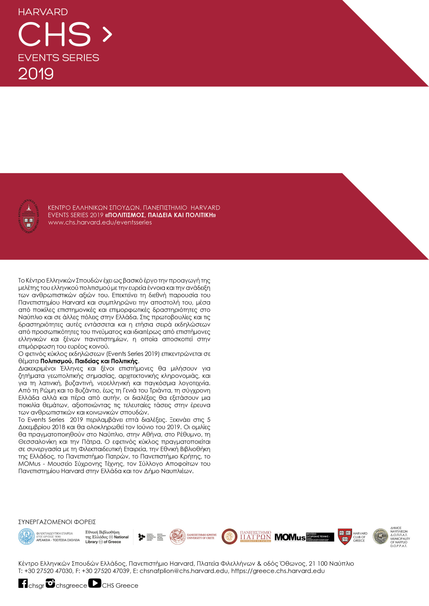 Περισσότερες πληροφορίες σχετικά με το Events Series του ΚΕΣ μπορείτε να βρείτε στην ιστοσελίδα του προγράμματος: www.chs.harvard.edu/eventsseries