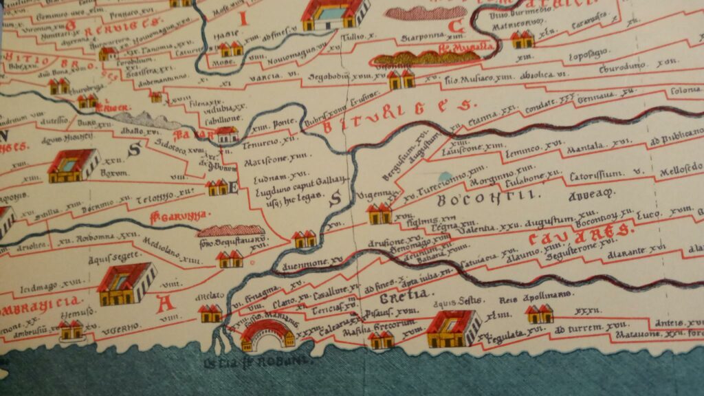 The map is named after Konrad Peutinger, a 16th century German antiquarian art and book collector. The original copy from 1200 is presently housed in the Austrian National Library in Vienna (Codex Vindobonensis 324). The date of the late antique original is not precise but there are some clues such as Constantinople which was founded in 328. The map also mentions Francia, which came into existence as a state in the 5th century (see image above).