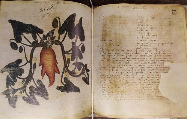 In examining the manuscript or book itself, we see that it is written in so called uncial script (seen to the right on the page above), an elegant, rounded letter script in all capital letters, popular from the 4th to the 8th century. Producing this very large, thick and tall, and heavy manuscript (37 × 31.2 cm − 491 folios, 982 pages) would have entailed the killing of several hundred animals, usually sheep, goats, and calves to produce the almost 500 folios made of vellum or parchment, animal skin. A folio consists of 2 pages, recto and verso, front and back, so almost 1,000 pages altogether. The manuscript contains ca. 400 extant, some are missing, full-page illustrations of medicinal plants describing in Greek (with later additions of plant names in Arabic, Hebrew, and several other languages) some 600 plants and many more herbal cures.