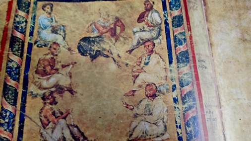 This miniature (above) on folio 3v depicts 7 physicians. They had to be 7 as it was a sacred number like in the 7 sages, among whom is the famous Galen of Pergamum (2nd c.) in the center, i.e., a hundred years after Dioscorides. In his works, Galen makes frequent references to De Materia Medica. He is flanked by Crateuas (ca. 2nd c. BCE), and Dioscorides himself, which may convey the influence on Galen of both Crateuas and Dioscorides. It is the earliest known miniature painting to use a solid gold-leaf background, which of course came to characterize religious Byzantine art, from household icons to mosaics adorning churches.