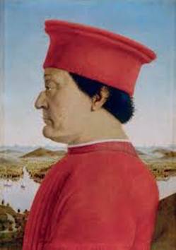 Many text pages are elaborately adorned with colorful and golden vignettes and border decorations. The manuscript illuminations are by well-known miniature painters and engravers, chiefly Francesco Rosselli and Pietro del Massaio (the illustrator of the maps). The manuscript was owned (possibly also commissioned) by Federico da Montefeltro, Duke of Urbino, seen below in a famous painting by Piero della Francesca.