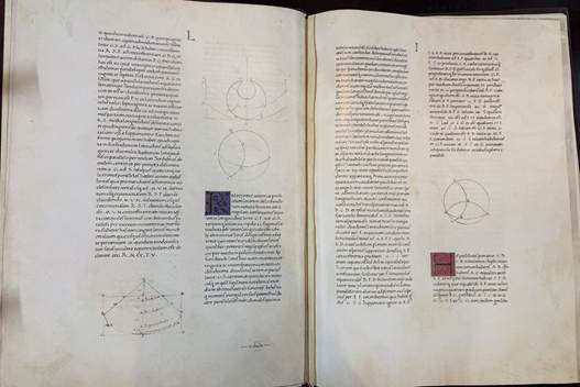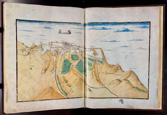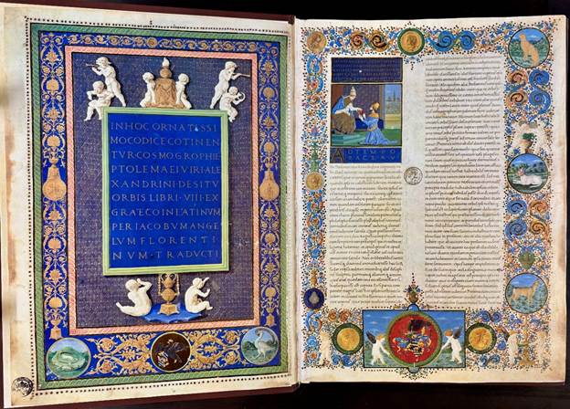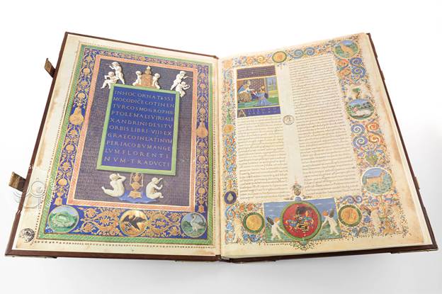 The codex in eight books, based on the number of papyrus rolls Ptolemy used, contains 44 maps of Europe, Asia, and Africa and a world map of 26 countries, as well as maps of major cities like Rome, Constantinople, Damascus, Jerusalem, Alexandria, Venice, Milan, Florence, and Volterra (the rather modest town had lost a battle to Montefeltro, thus its inclusion could be explained as an homage to the Duke or perhaps proscribed by him).