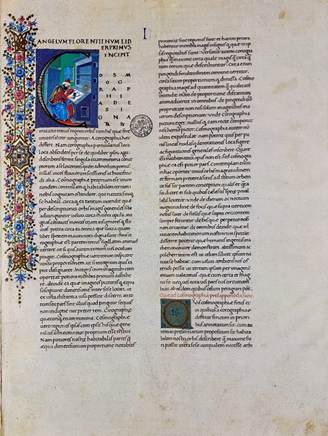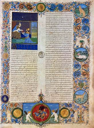 The frontispiece contains the usual menagerie of plants and animals (deer, leopard, dog, some imaginary or now extinct(?) animals), and arabesques with candelabras and vases in a manuscript from the renaissance, as also the obligatory putti or cherubs sounding trumpets and tambourines and triangles and bells, one putto is urinating, another popular motif during the renaissance, and the coat of arms of Montefeltro (Duke of Urbino). There are further medallions of Roman emperors Claudius, Trajan, and Augustus, depictions of Roman emperors being typical for the renaissance. The text on the title page reads: