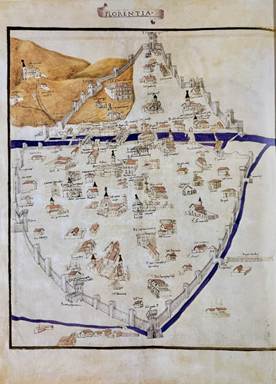 Florence with the Baptistery and Palazzo Vecchio and Piazza della Signoria, Palazzo Pitti, the Church of San Miniato, il Bargello, Orsanmichele, Santa Croce and San Lorenzo, Ponte Vecchio and the river Arno in the 1400s.