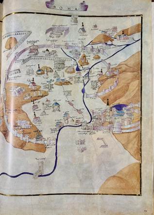 Rome with the Colosseum, Saint Peter’s, Castel Sant’Angelo, Tiber Island, the columns of Trajan and Marcus Aurelius, the Pantheon, Campidoglio, the Baths of Diocletian in the 1400s.