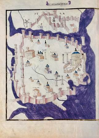 Constantinople with the Hippodrome and Hagia Sophia and the Byzantine wall and the ports in the 1400s.
