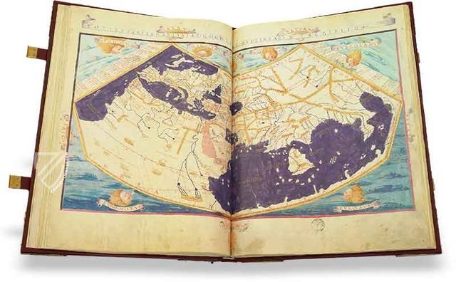 This manuscript facsimile features the first Latin translation from Greek of Ptolemy’s Geography (Γεωγραφικὴ Ὑφήγησις, geographical guide, Geographia Claudii Ptolemaei) undertaken by Jacopo di Angelo (Iacobus Angelus) from Scarperia, a small town just north of Florence, in 1409, published in this manuscript from 1472. Jacopo di Angelo gave the work the title Cosmographia to capture its use of astronomy (law of stars), going beyond simply describing Earth, geography. The maps were translated by Francesco di Lapacino and Domenico di Leonardo Boninsegni. The copyist is listed on folio 70 recto as Frenchman Hugues Commineau (Ital. Ugo Comminelli).