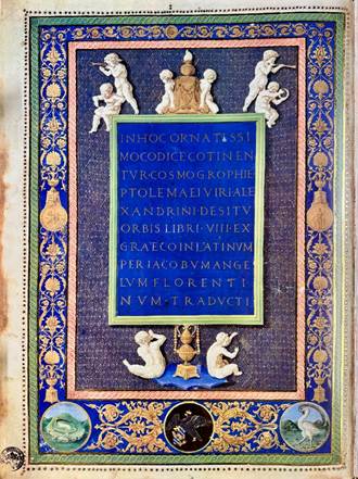 “In hoc ornatissimo codice continentvr Cosmographie Ptolemaei viri Alexandrini situ orbis libri VIII ex Graeco in Latinvm per Iacobvm Angelvm Florentinvm traducti”