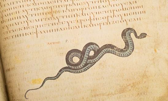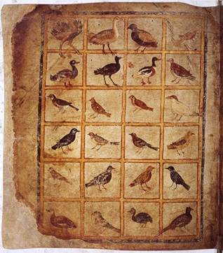 In addition to the text by Dioscorides, the manuscript has appended to it other interesting works such as a poem in hexameter (above) about herbs attributed to Rufus of Ephesus, another early physician; an ornithological treatise, in fact, the earliest preserved work on birds (see below), some 1700 years before Audubon, by a certain Dionysius, identified with either Dionysius of Philadelphia or Dionysius Periegetes, the author of a travel guide; and a work by Greek physician Nicander of Colophon on the treatment of snake bites (see below).