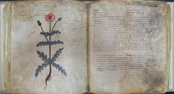 Fol. 223v: Μήκων ροϊάς, corn poppy …softens the bowel…treats inflammations…sleeping agent (transl. Lily Y. Beck, Pedanius Dioscorides of Anazarbus, De materia medica, Olms-Weidmann, 2005).