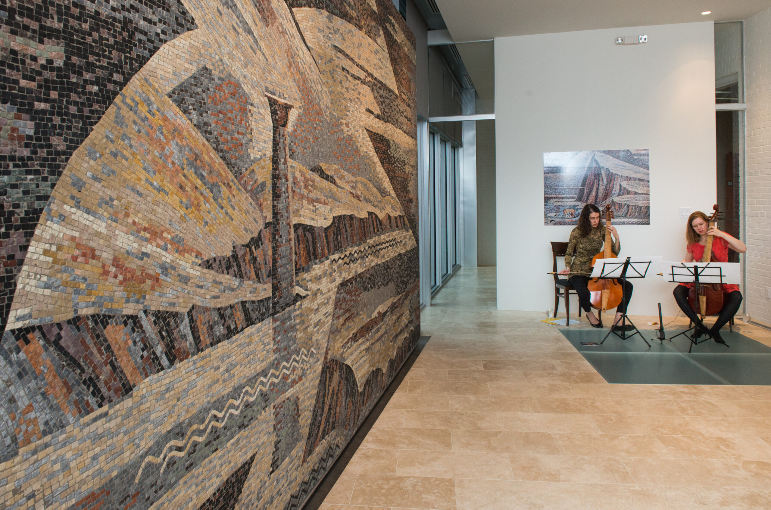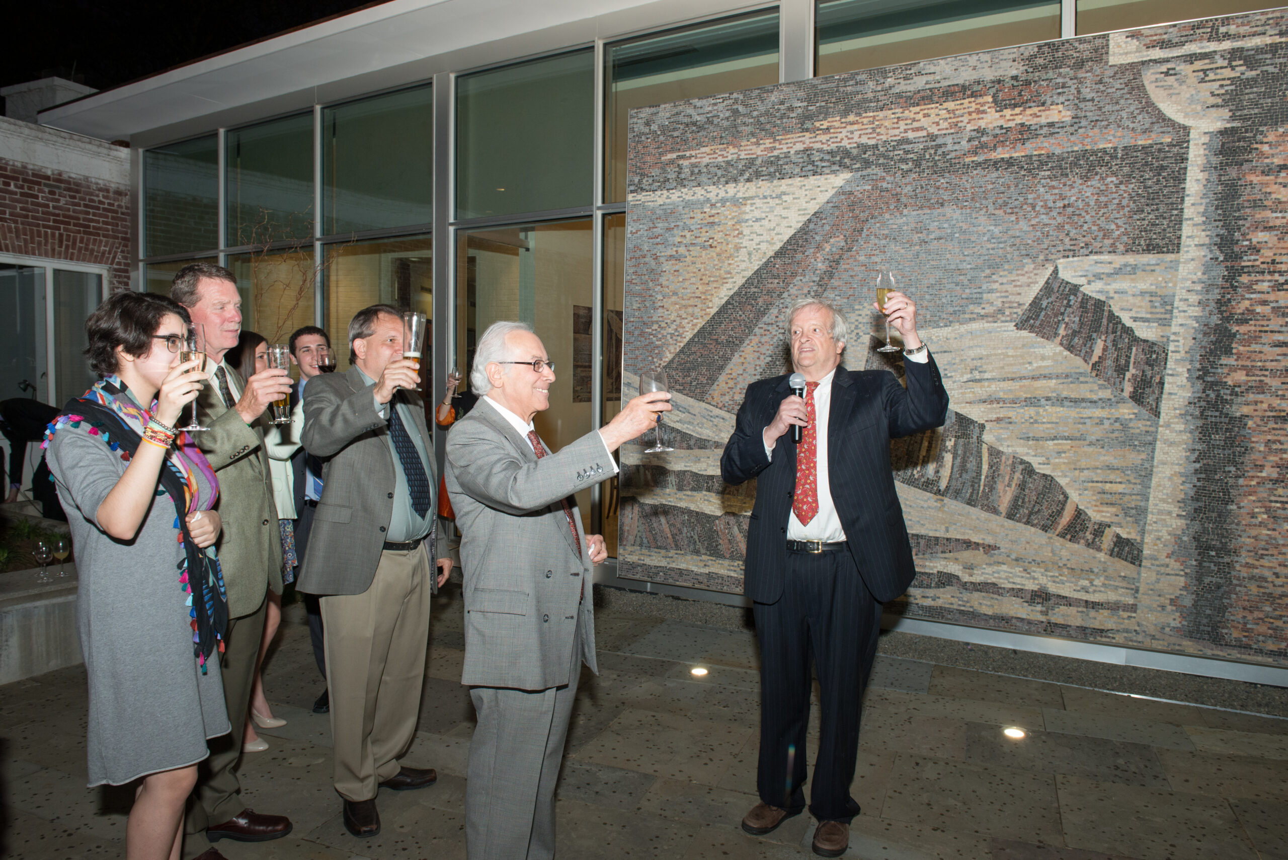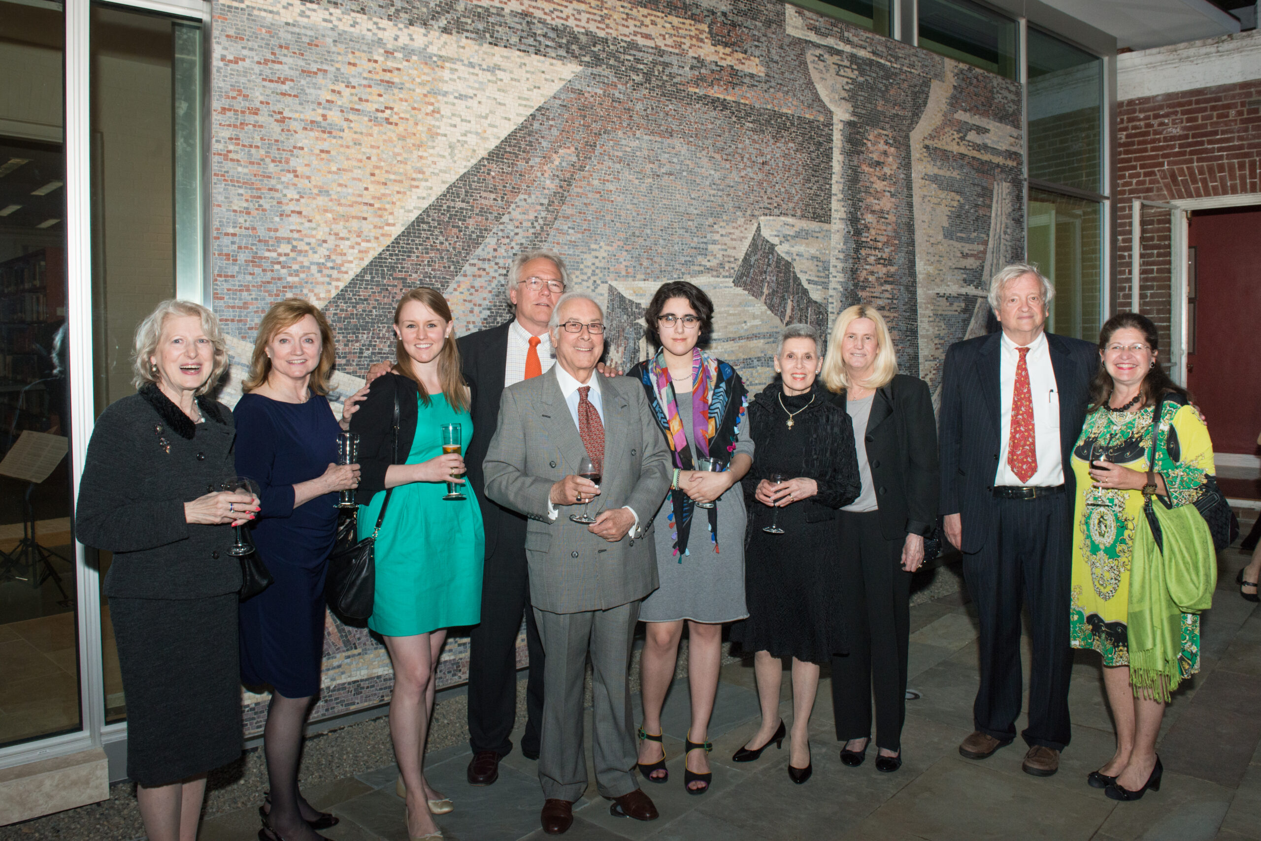 On Saturday, April 26, 2014 the Art Deco Murals of Hildreth Meière were in the spotlight. The Modern Greek Studies Program of the Classics Department at Georgetown University and the Center for Hellenic Studies in Washington, D.C. presented a program of lectures, held at Georgetown University, on the mosaics, their design and their restoration. Later in the evening, the Center for Hellenic Studies hosted a small gathering to welcome the Meière Mosaics to their new home. The courtyard was filled with friends of the CHS, who had the opportunity to admire the panels and enjoy the new spaces of the Center. The music to accompany the home coming of the two panels was composed by Eric Shimelonis, a well-known conductor and multi-instrumentalist in Washington, D.C.
